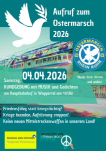 Wir unterstützen den Aufruf und die Veranstaltungen des Ostermarsch Rhein Ruhr, siehe Anhang